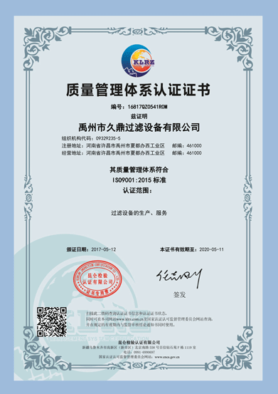 熱烈慶祝久鼎過濾于2017年05月順利通過國家權(quán)威認(rèn)證中心ISO9001:2015質(zhì)量管理體系認(rèn)證,并榮獲昆侖檢驗認(rèn)證有限公司頒發(fā)的“質(zhì)量管理體系認(rèn)證證書”,這標(biāo)志著我司已步入規(guī)范化、標(biāo)準(zhǔn)化、科學(xué)化的現(xiàn)代企業(yè)管理軌道。