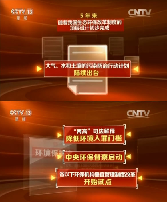 五年來,隨著我國(guó)生態(tài)環(huán)保改革制度的頂層設(shè)計(jì)初步完成,大氣、水和土壤的污染防治行動(dòng)計(jì)劃陸續(xù)出臺(tái),新《環(huán)境保護(hù)法》頒布施行,“兩高”司法解釋降低環(huán)境入罪門檻、中央環(huán)保督察啟動(dòng)、省以下環(huán)保機(jī)構(gòu)垂直管理制度改革開始試點(diǎn),各項(xiàng)關(guān)切民生的生態(tài)制度出臺(tái)的密集程度前所未有。
