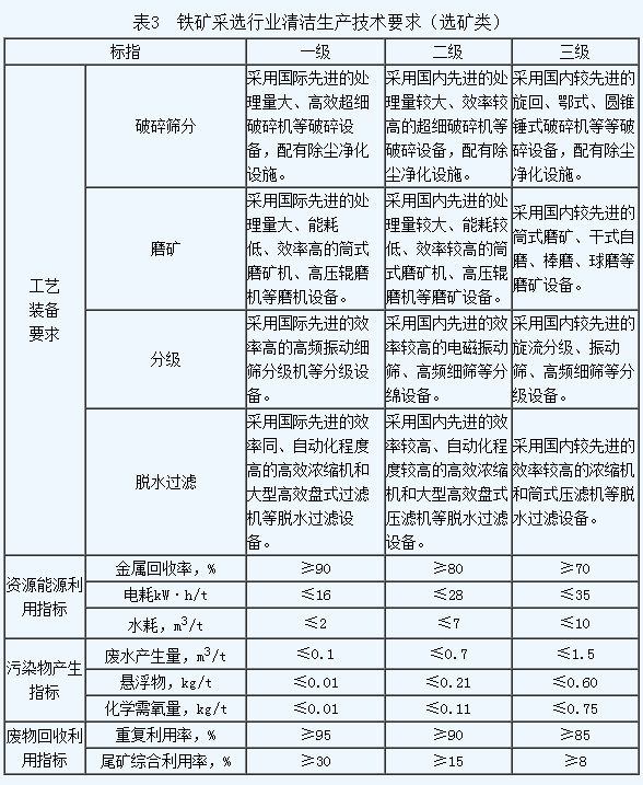 國家環(huán)??偩职l(fā)布了部分行業(yè)的清潔生產(chǎn)標(biāo)準(zhǔn),鐵礦采選行業(yè)清潔生產(chǎn)技術(shù)要求,如表3所示。