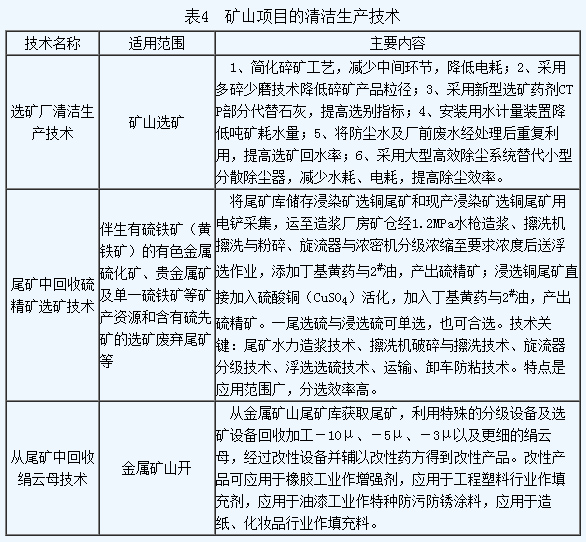 礦山項目的清潔生產(chǎn)技術(shù),如表4所示。