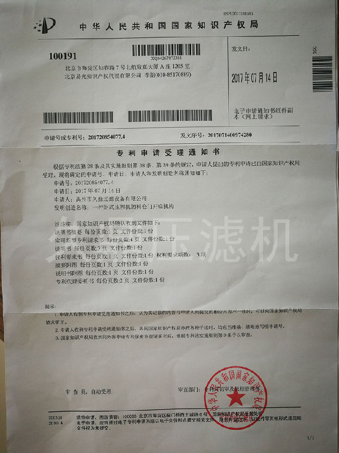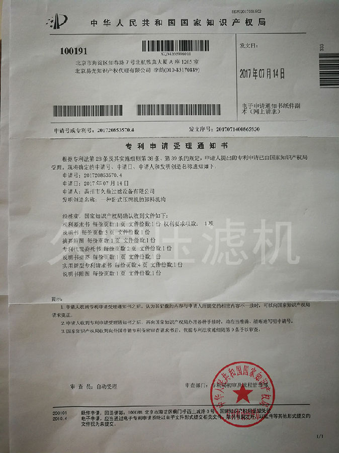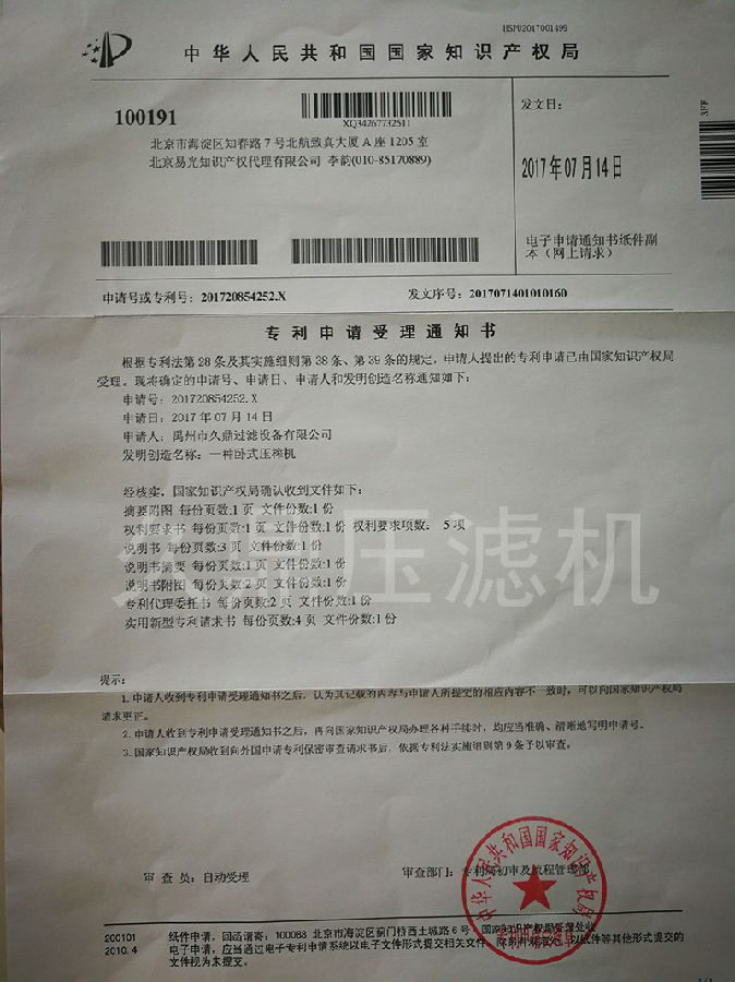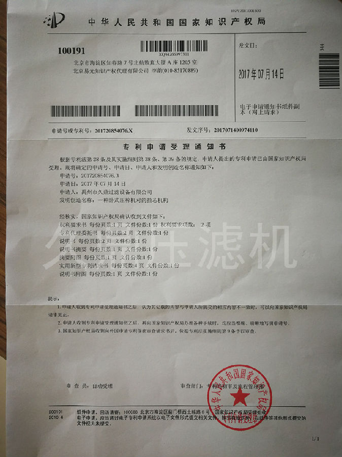 久鼎過濾設備廠家研發(fā)的一種臥式壓濾機等四種新品,國家知識產權局給予受理。我們的最新產品,從部件到整機都是自主研發(fā)設計。產品一投入到市場使用,就受到客戶的青睞和好評。新產品的上市不僅是給經銷商鼓足了勇氣,同時也在行業(yè)中樹立起了模范。作為質量服務雙滿意的榮譽公司,此次自主研發(fā)的新產品不僅是久鼎過濾設備有限公司科技研發(fā)實力邁向新的里程碑,也是行業(yè)內的一次創(chuàng)新,同時也大大提高了久鼎在市場中的競爭力。
