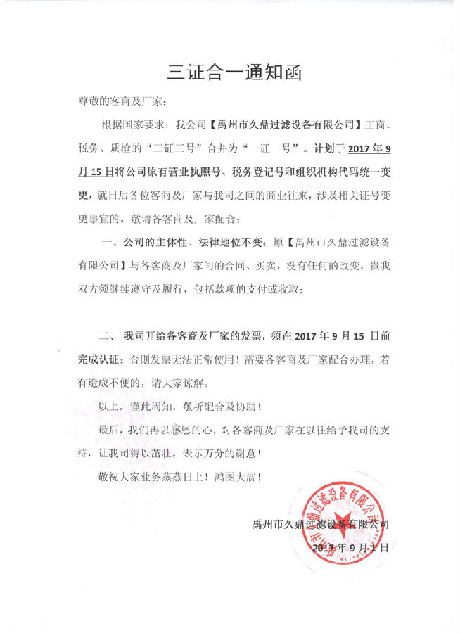 各客商及廠家請注意:“禹州市久鼎過濾設備有限公司”計劃于2017年9月15日將辦理三證合一,就日后各位客商及廠家與我司之間的商業(yè)往來,涉及相關整好變更事宜的,敬請各客商及廠家配合,謝謝!