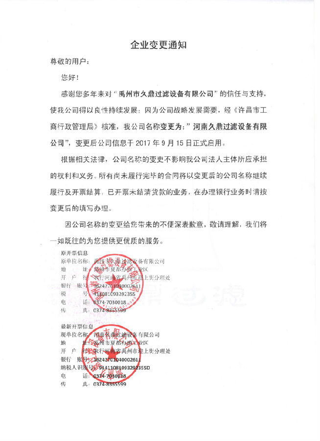 各客商及廠家請(qǐng)注意:因?yàn)楣緫?zhàn)略發(fā)展需要,經(jīng)《許昌市工商行政管理局》核準(zhǔn),“禹州市久鼎過濾設(shè)備有限公司”于2017年9月15日正式更名為“河南久鼎過濾設(shè)備有限公司”,變更后公司信息于2017年9月15日正式啟用。因公司名稱的變更給您帶來的不便深表歉意,敬請(qǐng)理解,謝謝!