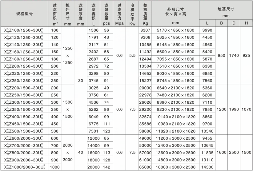 1250/1500/2000型液壓自動(dòng)拉板壓濾機(jī)技術(shù)參數(shù)